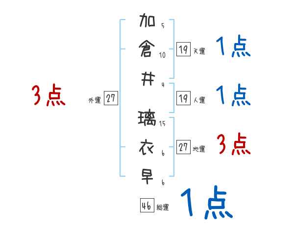 外運![]() | 加倉井璃衣早さんの外運は27画の3つ星!頭脳明晰だが強情で摩擦が多い傾向。孤立に注意。 生活面を象徴する運勢です。外部から受ける影響力を表し、結婚運、家庭運や職場、環境への順応性を表します。 |