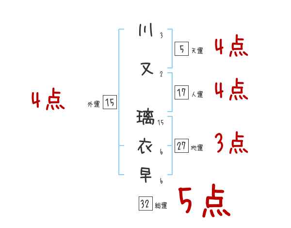 総運![]() | 川又璃衣早さんの総運は32画の5つ星!柔軟性があり成功する。チャンスが多く金運が良い。 あなたの人生を表す1番重要な運勢です。生涯を通じて影響する総合運となり、主に50歳以降の晩年期に影響を及ぼします。 |