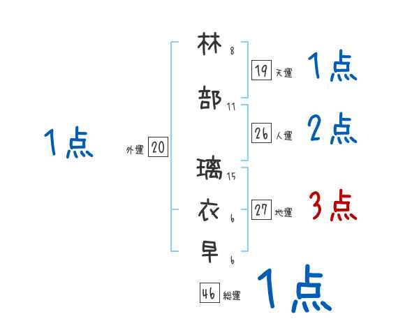 総運![]() | 林部璃衣早さんの総運は46画の1つ星!迷走することが多く苦労するかも。目先のことにとらわれないように。 あなたの人生を表す1番重要な運勢です。生涯を通じて影響する総合運となり、主に50歳以降の晩年期に影響を及ぼします。 |