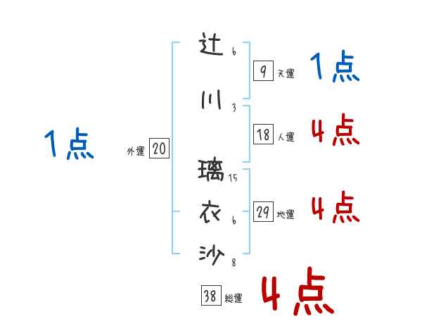天運![]() | 辻川璃衣沙さんの天運は9画の1つ星!消極的で才能を発揮することが苦手なことも。周りの意見に耳を傾けましょう。 家系が持つ宿命的な運勢を表します。祖先から受け継いだ苗字ですので自分の力が及びません。家柄を象徴します。 |