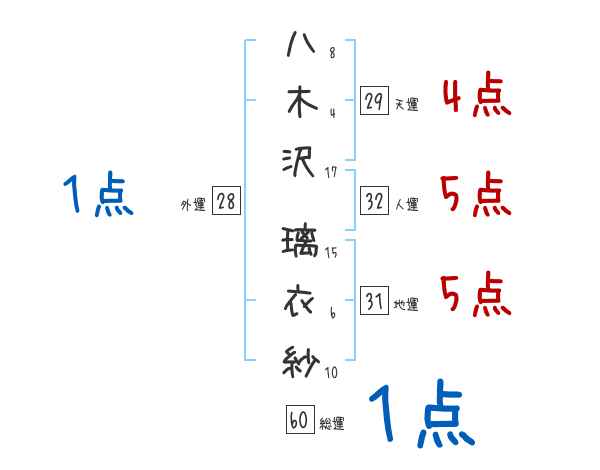 人運![]() | 八木沢璃衣紗さんの人運は32画の5つ星!柔軟性があり成功する。チャンスが多く金運が良い。 性格や才能などを表す2番目に重要な運勢です。人間関係や協調性、社会的な成功に影響します。主に20歳から50歳ぐらいまでの中年期の運勢を表します。 |