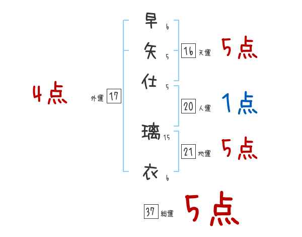 天運![]() | 早矢仕璃衣さんの天運は16画の5つ星!人望が厚く大きく発展する。逆転成功が見える。 家系が持つ宿命的な運勢を表します。祖先から受け継いだ苗字ですので自分の力が及びません。家柄を象徴します。 |