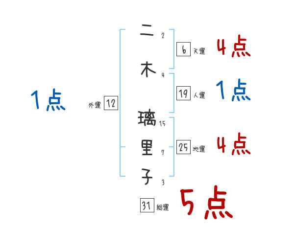 天運![]() | 二木璃里子さんの天運は6画の4つ星!慎重な努力家で信頼を得る。誠実な精神で向上心に優れる。 家系が持つ宿命的な運勢を表します。祖先から受け継いだ苗字ですので自分の力が及びません。家柄を象徴します。 |