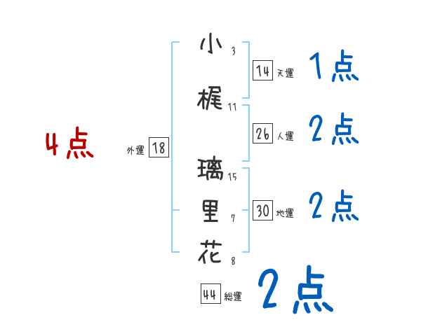 総運![]() | 小梶璃里花さんの総運は44画の2つ星!誠実で慎重な性格。物事を考えすぎないように注意しましょう。 あなたの人生を表す1番重要な運勢です。生涯を通じて影響する総合運となり、主に50歳以降の晩年期に影響を及ぼします。 |