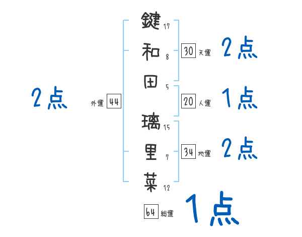 天運![]() | 鍵和田璃里菜さんの天運は30画の2つ星!浮き沈みの激しさに注意しましょう。 家系が持つ宿命的な運勢を表します。祖先から受け継いだ苗字ですので自分の力が及びません。家柄を象徴します。 |