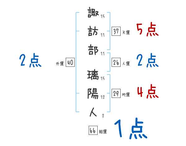 総運![]() | 諏訪部璃陽人さんの総運は66画の1つ星!迷うことが多く挫折しやすい傾向が。辛抱強く物事に取り組みましょう。 あなたの人生を表す1番重要な運勢です。生涯を通じて影響する総合運となり、主に50歳以降の晩年期に影響を及ぼします。 |