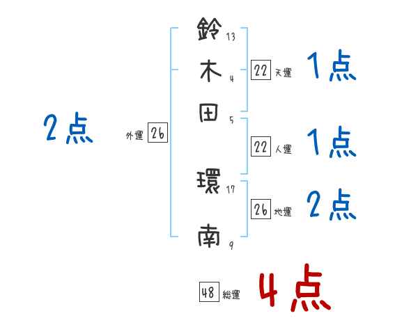 外運![]() | 鈴木田環南さんの外運は26画の2つ星!波瀾万丈かも。信頼できる人を大事にしましょう。 生活面を象徴する運勢です。外部から受ける影響力を表し、結婚運、家庭運や職場、環境への順応性を表します。 |