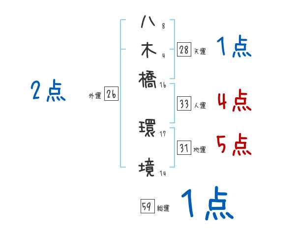 天運![]() | 八木橋環境さんの天運は28画の1つ星!家庭環境に注意。スポーツで活躍できる能力があるかも。 家系が持つ宿命的な運勢を表します。祖先から受け継いだ苗字ですので自分の力が及びません。家柄を象徴します。 |