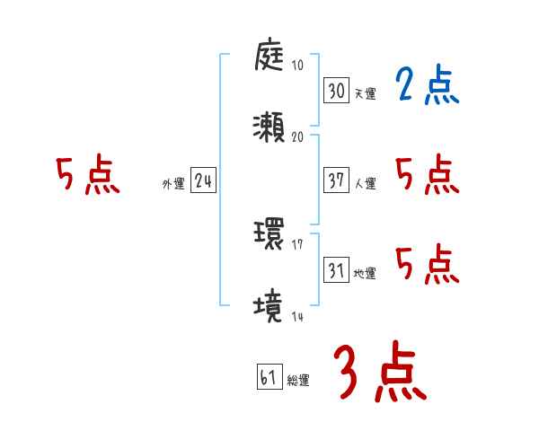 天運![]() | 庭瀬環境さんの天運は30画の2つ星!浮き沈みの激しさに注意しましょう。 家系が持つ宿命的な運勢を表します。祖先から受け継いだ苗字ですので自分の力が及びません。家柄を象徴します。 |