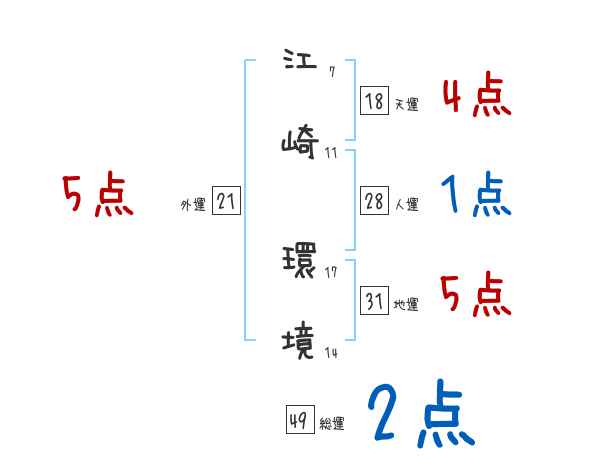 外運![]() | 江崎環境さんの外運は21画の5つ星!統率力がある。独立し成功する。名誉を手に入れる。 生活面を象徴する運勢です。外部から受ける影響力を表し、結婚運、家庭運や職場、環境への順応性を表します。 |