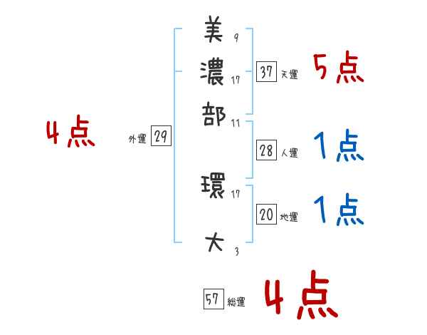 外運![]() | 美濃部環大さんの外運は29画の4つ星!完全主義で才能がある。厳格な心の持ち主。 生活面を象徴する運勢です。外部から受ける影響力を表し、結婚運、家庭運や職場、環境への順応性を表します。 |