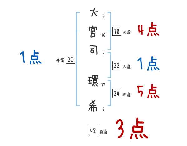 天運![]() | 大宮司環希さんの天運は18画の4つ星!情熱的で剛気。忍耐力があり信頼される。 家系が持つ宿命的な運勢を表します。祖先から受け継いだ苗字ですので自分の力が及びません。家柄を象徴します。 |