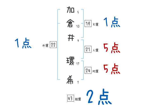 天運![]() | 加倉井環希さんの天運は19画の1つ星!優れた才能を持ちますが、協調性が足りないことも。周りの人と協力する事を意識しましょう。 家系が持つ宿命的な運勢を表します。祖先から受け継いだ苗字ですので自分の力が及びません。家柄を象徴します。 |
