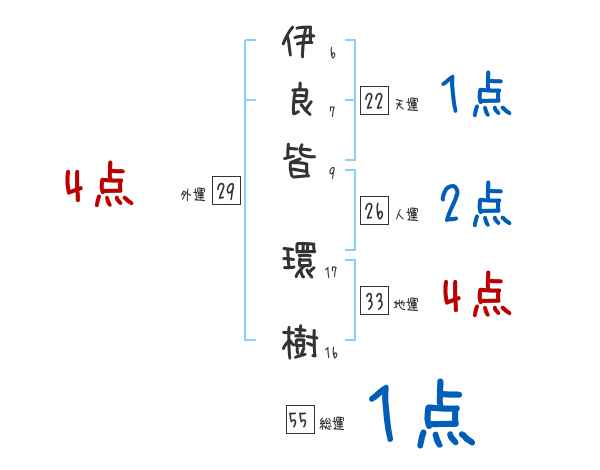 地運![]() | 伊良皆環樹さんの地運は33画の4つ星!権力志向でプライドが高い。勇気があり運を切り開き成功する。 個性を表す基礎的な運勢です。性格形成や対人関係、行動力など家庭環境に影響されます。主に誕生してから20歳くらいまでの若年期の運勢を表します。 |