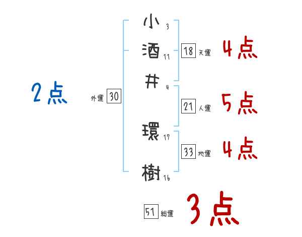 人運![]() | 小酒井環樹さんの人運は21画の5つ星!統率力がある。独立し成功する。名誉を手に入れる。 性格や才能などを表す2番目に重要な運勢です。人間関係や協調性、社会的な成功に影響します。主に20歳から50歳ぐらいまでの中年期の運勢を表します。 |