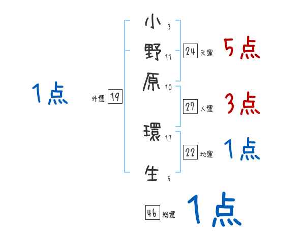 外運![]() | 小野原環生さんの外運は19画の1つ星!優れた才能を持ちますが、協調性が足りないことも。周りの人と協力する事を意識しましょう。 生活面を象徴する運勢です。外部から受ける影響力を表し、結婚運、家庭運や職場、環境への順応性を表します。 |