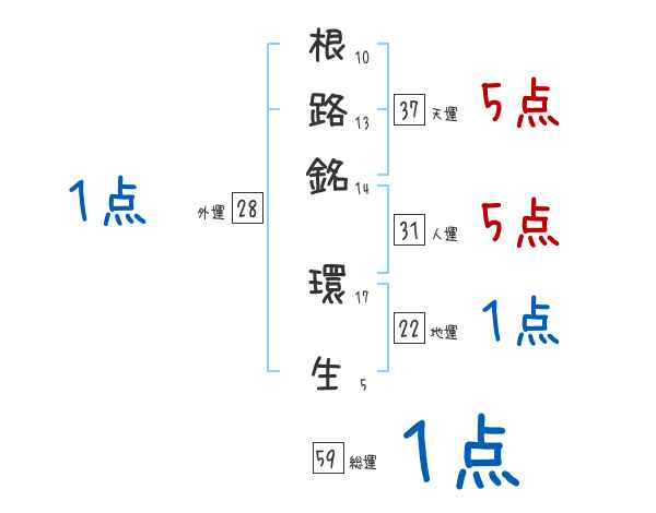 外運![]() | 根路銘環生さんの外運は28画の1つ星!家庭環境に注意。スポーツで活躍できる能力があるかも。 生活面を象徴する運勢です。外部から受ける影響力を表し、結婚運、家庭運や職場、環境への順応性を表します。 |