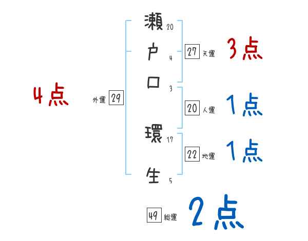 外運![]() | 瀬戸口環生さんの外運は29画の4つ星!完全主義で才能がある。厳格な心の持ち主。 生活面を象徴する運勢です。外部から受ける影響力を表し、結婚運、家庭運や職場、環境への順応性を表します。 |