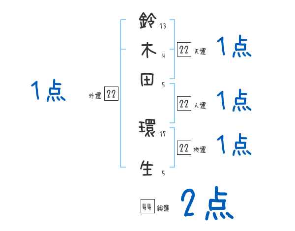 総運![]() | 鈴木田環生さんの総運は44画の2つ星!誠実で慎重な性格。物事を考えすぎないように注意しましょう。 あなたの人生を表す1番重要な運勢です。生涯を通じて影響する総合運となり、主に50歳以降の晩年期に影響を及ぼします。 |