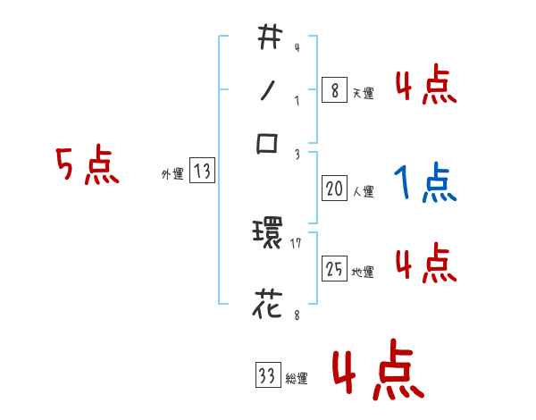 天運![]() | 井ノ口環花さんの天運は8画の4つ星!勤勉家。根気強く努力し成功する。忍耐力がある。 家系が持つ宿命的な運勢を表します。祖先から受け継いだ苗字ですので自分の力が及びません。家柄を象徴します。 |