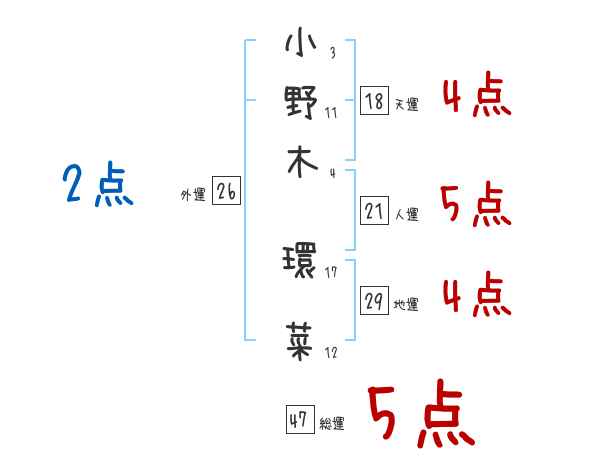 総運![]() | 小野木環菜さんの総運は47画の5つ星!実力が開花し発展する円満な人生。財に恵まれる。 あなたの人生を表す1番重要な運勢です。生涯を通じて影響する総合運となり、主に50歳以降の晩年期に影響を及ぼします。 |