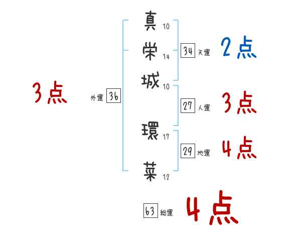 人運![]() | 真栄城環菜さんの人運は27画の3つ星!頭脳明晰だが強情で摩擦が多い傾向。孤立に注意。 性格や才能などを表す2番目に重要な運勢です。人間関係や協調性、社会的な成功に影響します。主に20歳から50歳ぐらいまでの中年期の運勢を表します。 |