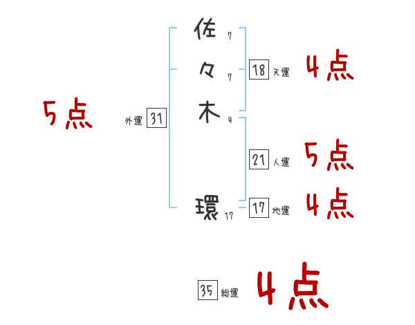 天運![]() | 佐々木環さんの天運は18画の4つ星!情熱的で剛気。忍耐力があり信頼される。 家系が持つ宿命的な運勢を表します。祖先から受け継いだ苗字ですので自分の力が及びません。家柄を象徴します。 |