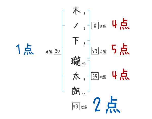 総運![]() | 木ノ下瓏太朗さんの総運は43画の2つ星!頑固な性格で独立心が強いかも。やや非現実的で浪費に注意しましょう。 あなたの人生を表す1番重要な運勢です。生涯を通じて影響する総合運となり、主に50歳以降の晩年期に影響を及ぼします。 |