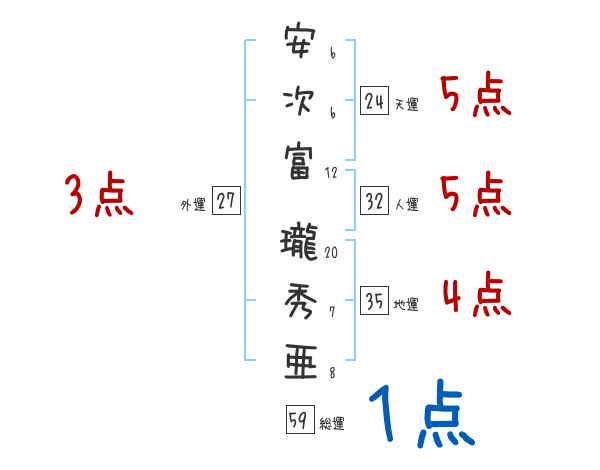 人運![]() | 安次富瓏秀亜さんの人運は32画の5つ星!柔軟性があり成功する。チャンスが多く金運が良い。 性格や才能などを表す2番目に重要な運勢です。人間関係や協調性、社会的な成功に影響します。主に20歳から50歳ぐらいまでの中年期の運勢を表します。 |