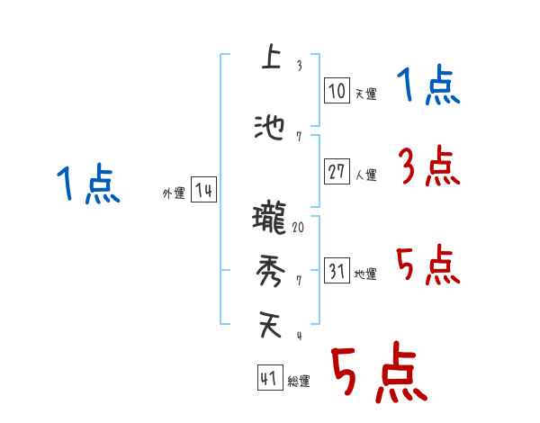 天運![]()  | 上池瓏秀天さんの天運は10画の1つ星!不安を感じやすい傾向。ストレスを抱えないように注意しましょう。 家系が持つ宿命的な運勢を表します。祖先から受け継いだ苗字ですので自分の力が及びません。家柄を象徴します。 |