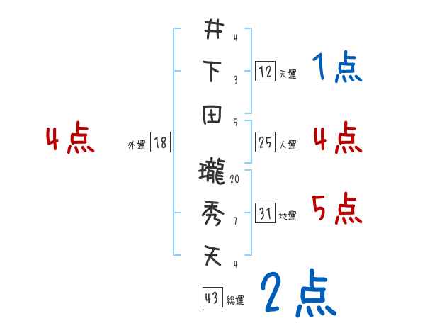 天運![]() | 井下田瓏秀天さんの天運は12画の1つ星!簡単な失敗で諦めてしまいやすいかも。着実に行動すると良いでしょう。 家系が持つ宿命的な運勢を表します。祖先から受け継いだ苗字ですので自分の力が及びません。家柄を象徴します。 |