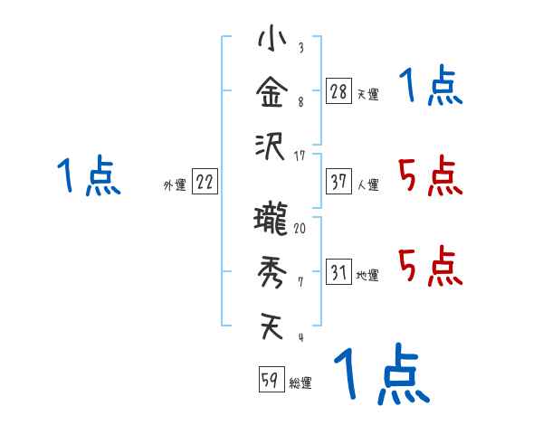 天運![]() | 小金沢瓏秀天さんの天運は28画の1つ星!家庭環境に注意。スポーツで活躍できる能力があるかも。 家系が持つ宿命的な運勢を表します。祖先から受け継いだ苗字ですので自分の力が及びません。家柄を象徴します。 |