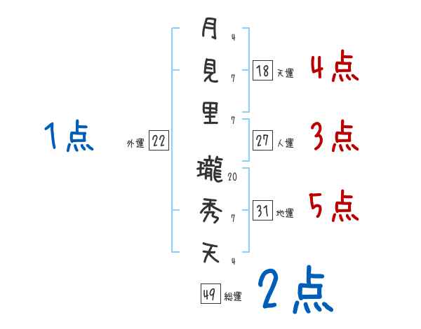 天運![]() | 月見里瓏秀天さんの天運は18画の4つ星!情熱的で剛気。忍耐力があり信頼される。 家系が持つ宿命的な運勢を表します。祖先から受け継いだ苗字ですので自分の力が及びません。家柄を象徴します。 |