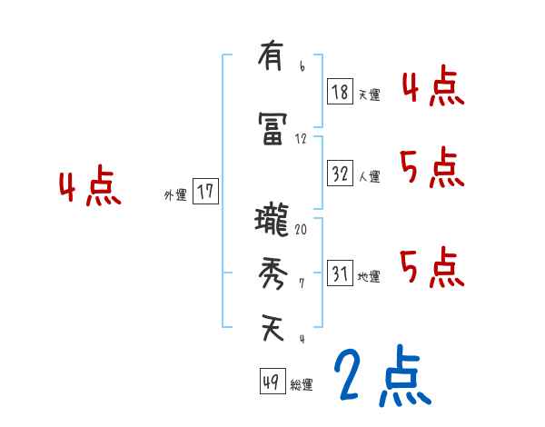 人運![]() | 有冨瓏秀天さんの人運は32画の5つ星!柔軟性があり成功する。チャンスが多く金運が良い。 性格や才能などを表す2番目に重要な運勢です。人間関係や協調性、社会的な成功に影響します。主に20歳から50歳ぐらいまでの中年期の運勢を表します。 |
