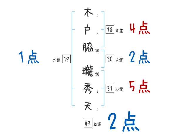 天運![]() | 木戸脇瓏秀天さんの天運は18画の4つ星!情熱的で剛気。忍耐力があり信頼される。 家系が持つ宿命的な運勢を表します。祖先から受け継いだ苗字ですので自分の力が及びません。家柄を象徴します。 |