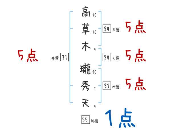 天運![]() | 高草木瓏秀天さんの天運は24画の5つ星!家庭運が良く順調な人生。金運にも恵まれる。 家系が持つ宿命的な運勢を表します。祖先から受け継いだ苗字ですので自分の力が及びません。家柄を象徴します。 |