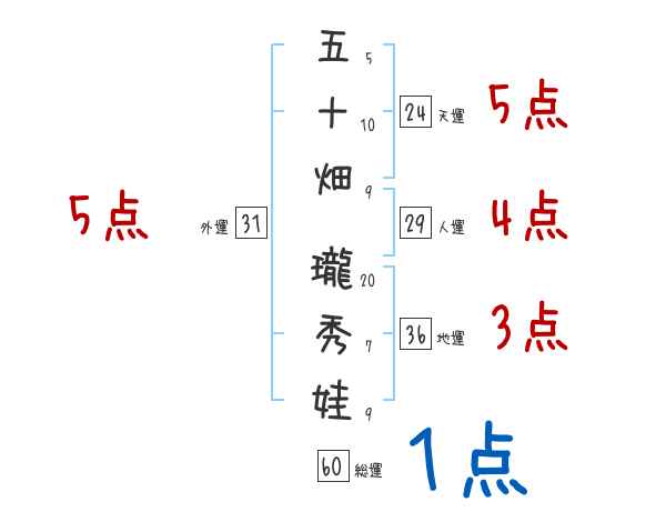天運![]() | 五十畑瓏秀娃さんの天運は24画の5つ星!家庭運が良く順調な人生。金運にも恵まれる。 家系が持つ宿命的な運勢を表します。祖先から受け継いだ苗字ですので自分の力が及びません。家柄を象徴します。 |