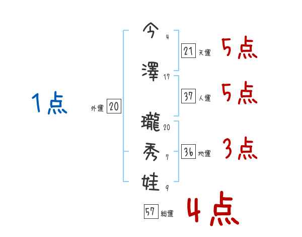 天運![]() | 今澤瓏秀娃さんの天運は21画の5つ星!統率力がある。独立し成功する。名誉を手に入れる。 家系が持つ宿命的な運勢を表します。祖先から受け継いだ苗字ですので自分の力が及びません。家柄を象徴します。 |