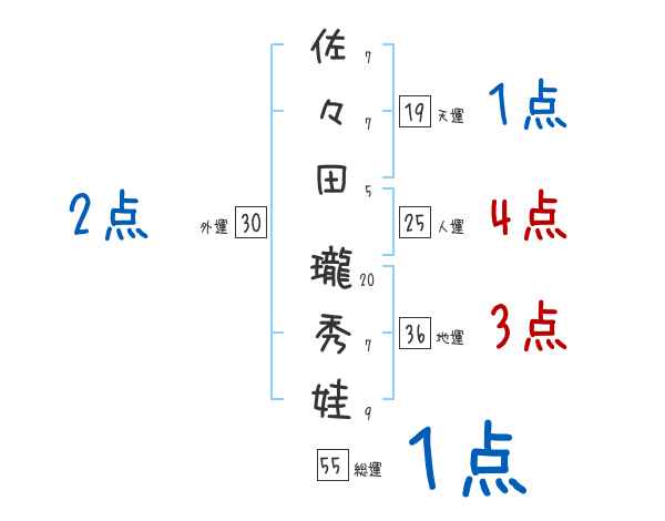 地運![]() | 佐々田瓏秀娃さんの地運は36画の3つ星!先見性が豊かです。多少神経質で苦労することも。 個性を表す基礎的な運勢です。性格形成や対人関係、行動力など家庭環境に影響されます。主に誕生してから20歳くらいまでの若年期の運勢を表します。 |