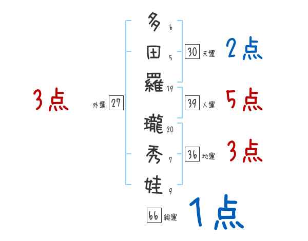 地運![]() | 多田羅瓏秀娃さんの地運は36画の3つ星!先見性が豊かです。多少神経質で苦労することも。 個性を表す基礎的な運勢です。性格形成や対人関係、行動力など家庭環境に影響されます。主に誕生してから20歳くらいまでの若年期の運勢を表します。 |