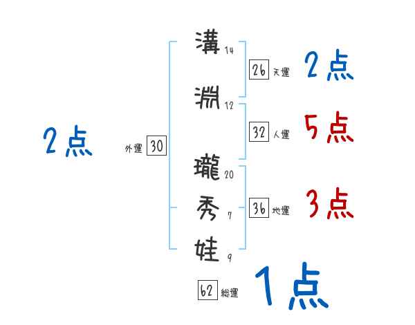 人運![]() | 溝淵瓏秀娃さんの人運は32画の5つ星!柔軟性があり成功する。チャンスが多く金運が良い。 性格や才能などを表す2番目に重要な運勢です。人間関係や協調性、社会的な成功に影響します。主に20歳から50歳ぐらいまでの中年期の運勢を表します。 |