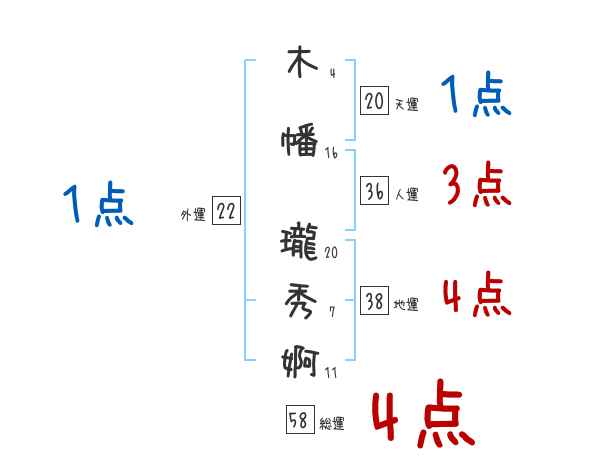 外運![]() | 木幡瓏秀婀さんの外運は22画の1つ星!努力することが苦手ないっぽう手先が器用。芸術性にも優れる。 生活面を象徴する運勢です。外部から受ける影響力を表し、結婚運、家庭運や職場、環境への順応性を表します。 |