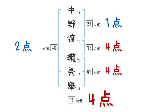 総運![]() | 中野渡瓏秀擧さんの総運は73画の4つ星!天徳のある人生。散財に注意すれば晩年幸福。 あなたの人生を表す1番重要な運勢です。生涯を通じて影響する総合運となり、主に50歳以降の晩年期に影響を及ぼします。 |