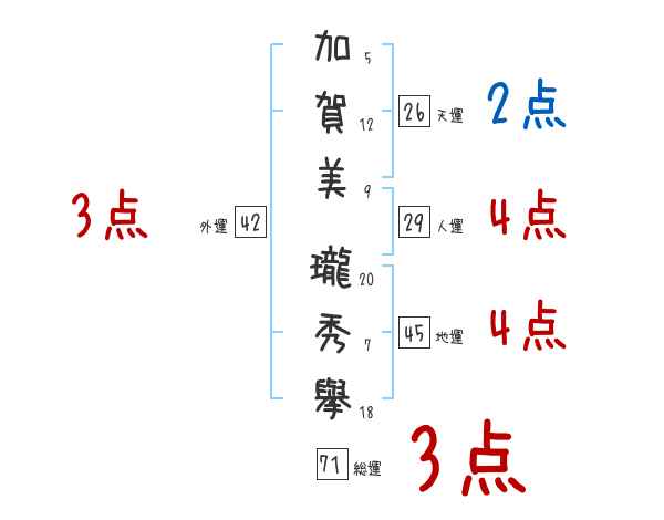 | 総運  | 加賀美瓏秀擧さんの総運は71画の3つ星!力が弱く小心者だが、いずれ安泰を手に入れる。あなたの人生を表す1番重要な運勢です。生涯を通じて影響する総合運となり、主に50歳以降の晩年期に影響を及ぼします。 |