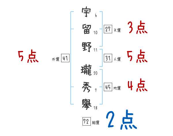 総運![]() | 宇留野瓏秀擧さんの総運は72画の2つ星!災難が多く不安定な生活にならないように注意。明暗のある人生かも。 あなたの人生を表す1番重要な運勢です。生涯を通じて影響する総合運となり、主に50歳以降の晩年期に影響を及ぼします。 |