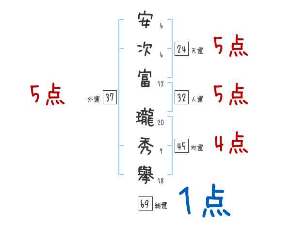 外運![]() | 安次富瓏秀擧さんの外運は37画の5つ星!努力家で順応性に優れる。現実的な考え方ができ忠実に物事をこなす。 生活面を象徴する運勢です。外部から受ける影響力を表し、結婚運、家庭運や職場、環境への順応性を表します。 |