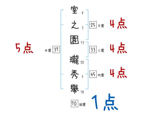 外運![]() | 室之園瓏秀擧さんの外運は37画の5つ星!努力家で順応性に優れる。現実的な考え方ができ忠実に物事をこなす。 生活面を象徴する運勢です。外部から受ける影響力を表し、結婚運、家庭運や職場、環境への順応性を表します。 |