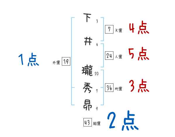 天運![]() | 下井瓏秀昴さんの天運は7画の4つ星!強い意志や信念を持ち独立心が強い。自立する。 家系が持つ宿命的な運勢を表します。祖先から受け継いだ苗字ですので自分の力が及びません。家柄を象徴します。 |