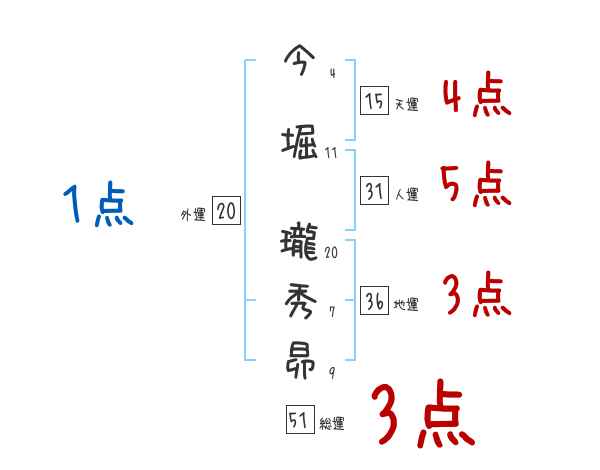 総運![]() | 今堀瓏秀昴さんの総運は51画の3つ星!変化が激しく、危険に注意。堅実な性格。 あなたの人生を表す1番重要な運勢です。生涯を通じて影響する総合運となり、主に50歳以降の晩年期に影響を及ぼします。 |