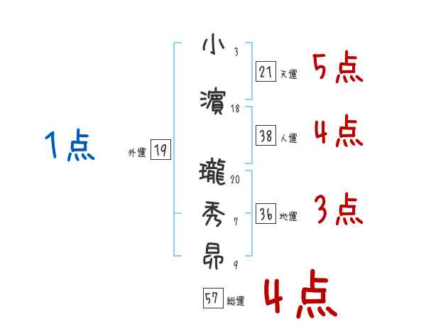 天運![]() | 小濵瓏秀昴さんの天運は21画の5つ星!統率力がある。独立し成功する。名誉を手に入れる。 家系が持つ宿命的な運勢を表します。祖先から受け継いだ苗字ですので自分の力が及びません。家柄を象徴します。 |